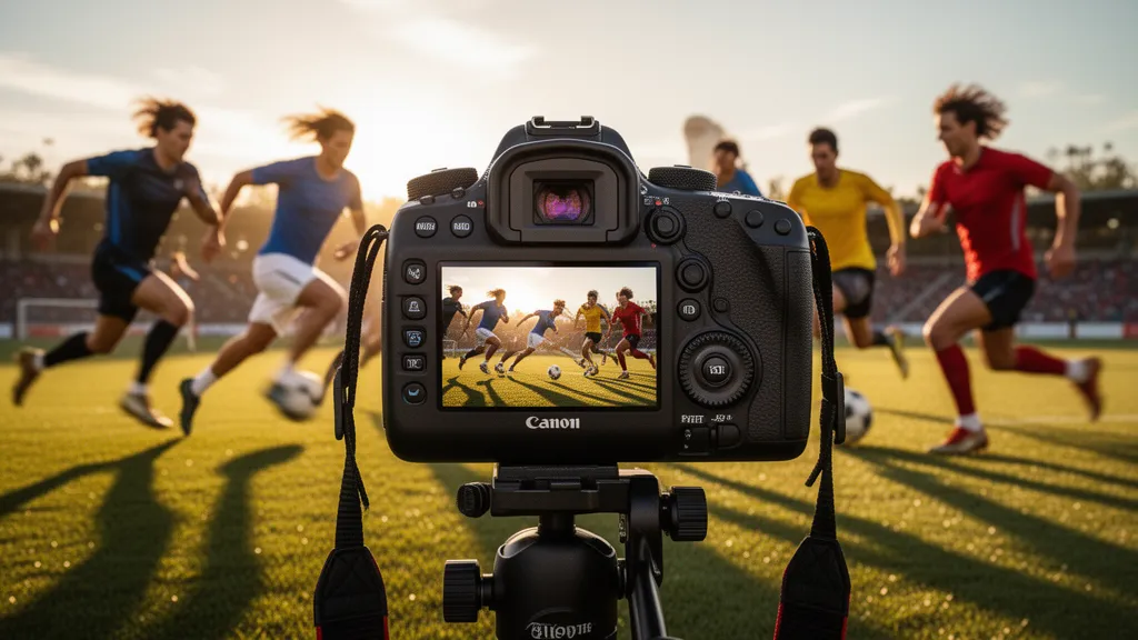 For the best results, use shutter priority mode with speeds of 1/500s or faster, continuous autofocus (AI Servo), and burst mode. Higher ISO settings (1600-6400) help in indoor or evening games while maintaining fast shutter speeds.